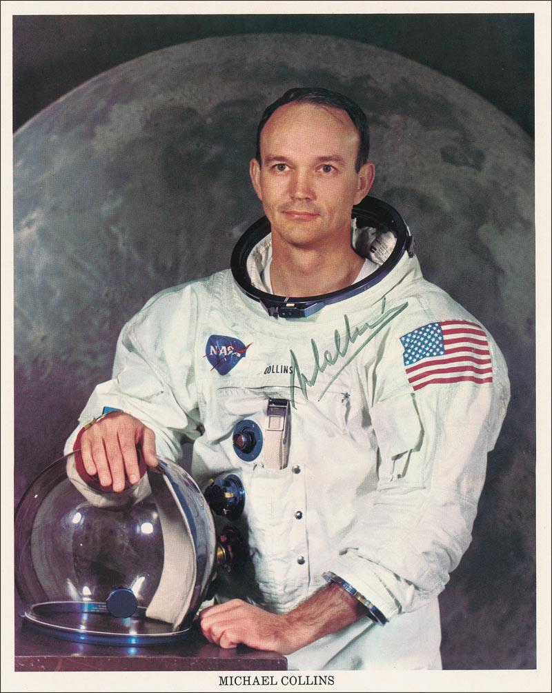 Color 8 x 10 NASA photo of Collins posing in his flight suit against a lunar background, signed in black felt tip. In fine condition, with a couple tape remnants on reverse. Pre-certified Scott Cornish and RRAuction COA.