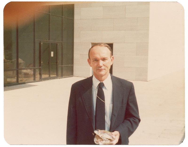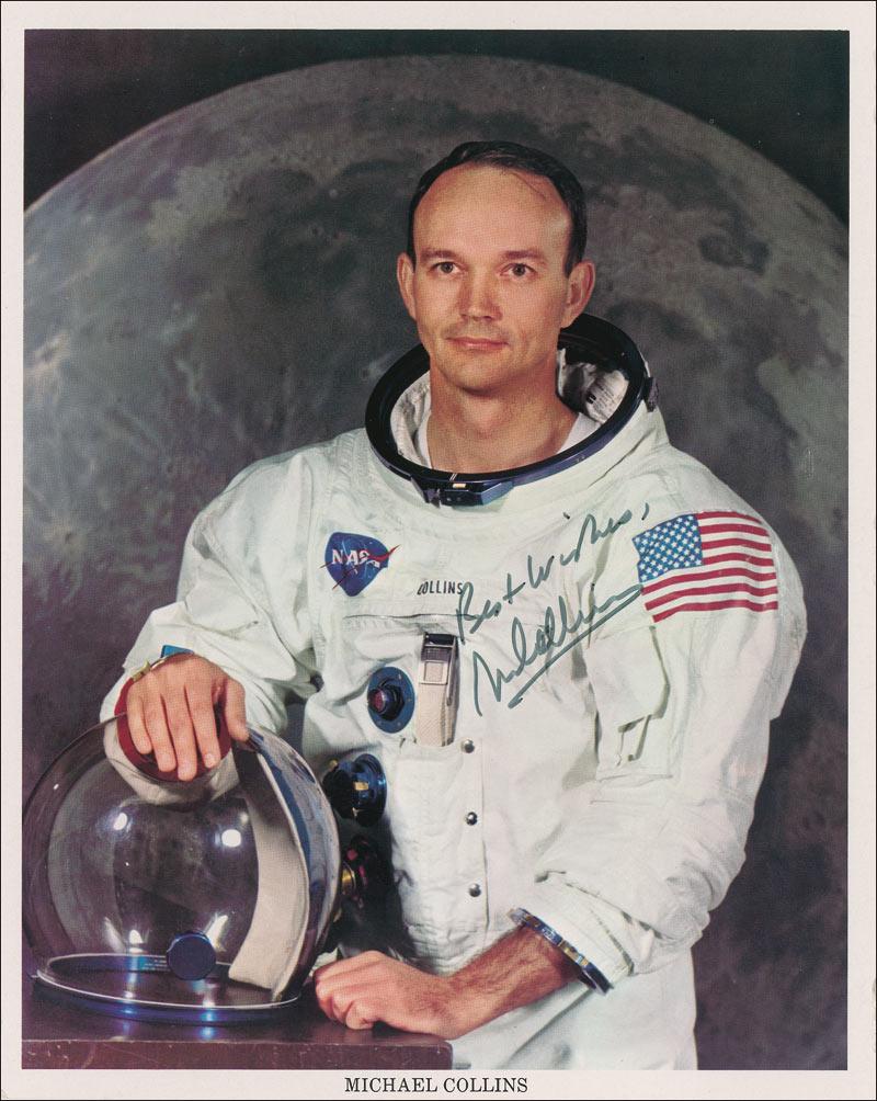 Color 8 x 10 NASA photo of Collins posing in his flight suit against a lunar background, signed in black felt tip. In fine condition, with light binder dings to right edge, and a couple trivial surface marks. Accompanied by a 1975 candid color snapshot of Collins standing outside. Pre-certified Scott Cornish and RRAuction COA.