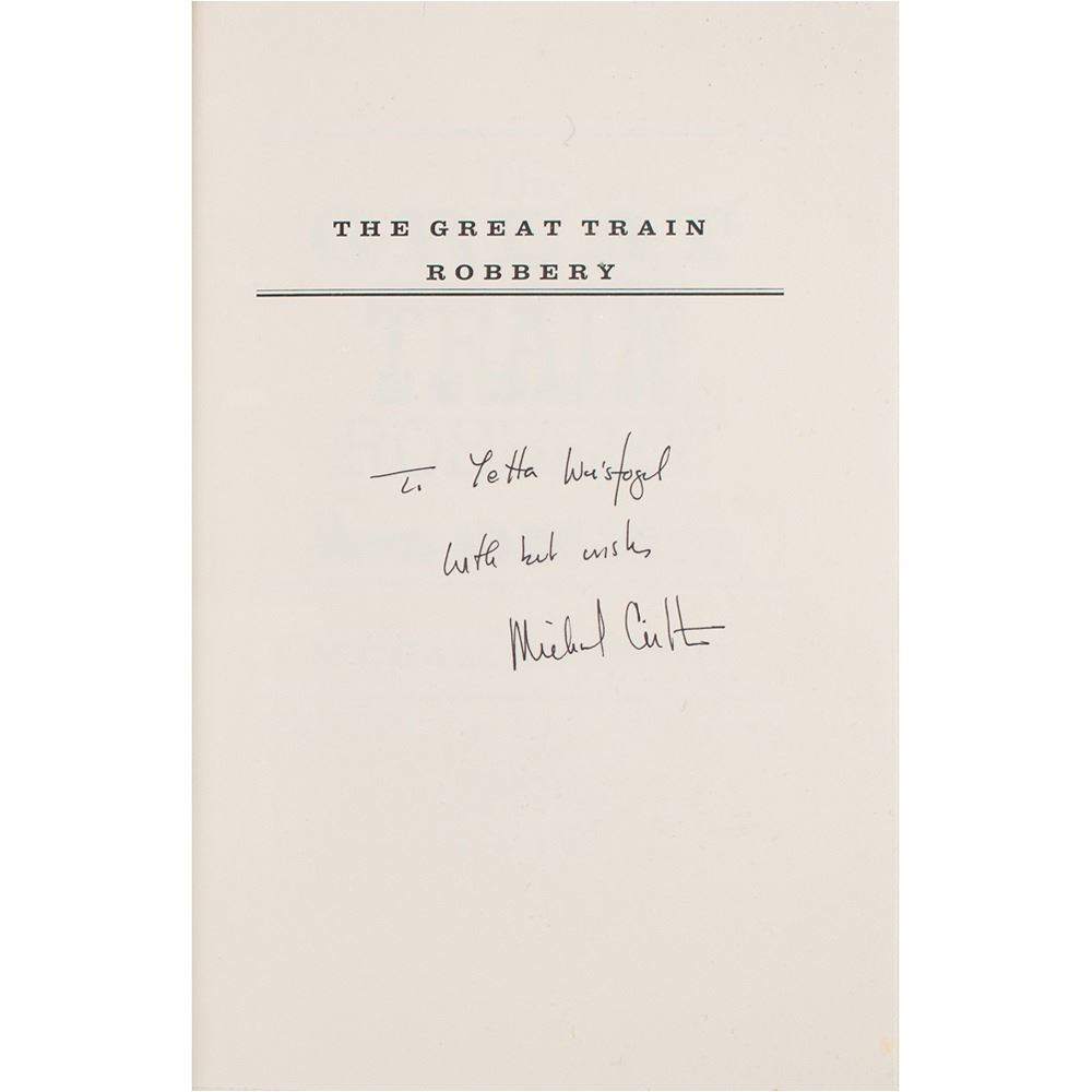 Signed book: The Great Train Robbery. First edition. NY: Alfred A. Knopf, 1975. Hardcover with dust jacket, 6 x 8.75, 266 pages. Signed and inscribed on the half-title page in black ink, "To Zetta Weisfogel, with best wishes, Michael Crichton." In fine condition. Crichton's third novel under his own name and his thirteenth novel overall, The Great Train Robbery was one of the best-selling books in 1975 and three years later was adapted into a film starring Sean Connery, Donald Sutherland, and Lesley-Anne Down. Crichton directed the film and, accordingly, he also wrote the screenplay.