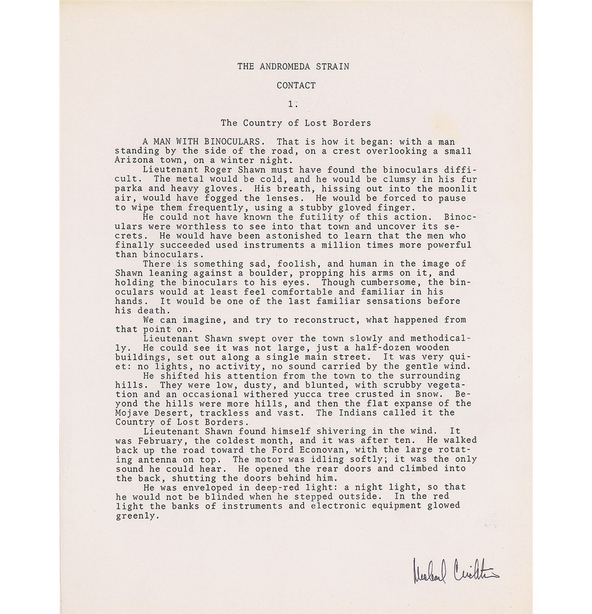 Souvenir typescript, one page, 8.5 x 11, an excerpt from the beginning of The Andromeda Strain. In part: “A man with binoculars. That is how it all began; with a man standing by the side of the road, on a crest overlooking a small Arizona town, on a winter night.” Signed at the conclusion in black felt tip by Crichton. A slight crease and small stain to the tip, otherwise fine condition.