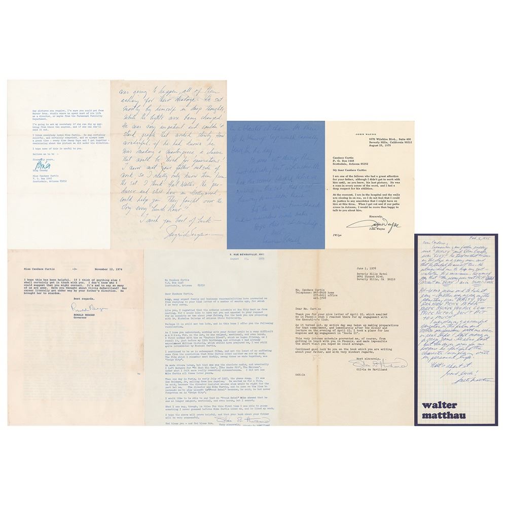 Collection of 23 letters from various Hollywood stars and filmmakers to Candace Curtiz, the daughter of Oscar-winning director Michael Curtiz, sending personal anecdotes about her father that she intends on using for a book. Dated between 1974 and 1978, the collection, which consists of nine ALSs and 14 TLSs for a total of 36 pages, offers a wealth of insightful and often amusing stories regarding the notoriously difficult-to-work-with director, with many of the letters featuring fond if not entirely frank remembrances of the Curtiz method of tough-love moviemaking. The collection includes letters from Ingrid Bergman, Ronald Reagan, John Wayne, Lauren Bacall, Olivia de Havilland (2), Bing Crosby, Walter Matthau, Robert Buckner, Nanette Fabray (2), John Gavin (2), Lou Greenspan, Carolyn Jones, Garson Kanin, Howard Koch (2), Rosalind Russell, Rudy Vallee, Hal Wallis, and Michael Wilding. Also includes a letter from Kirk Douglas that has been signed in a secretarial hand. The majority of the letters are accompanied by their original mailing envelopes.