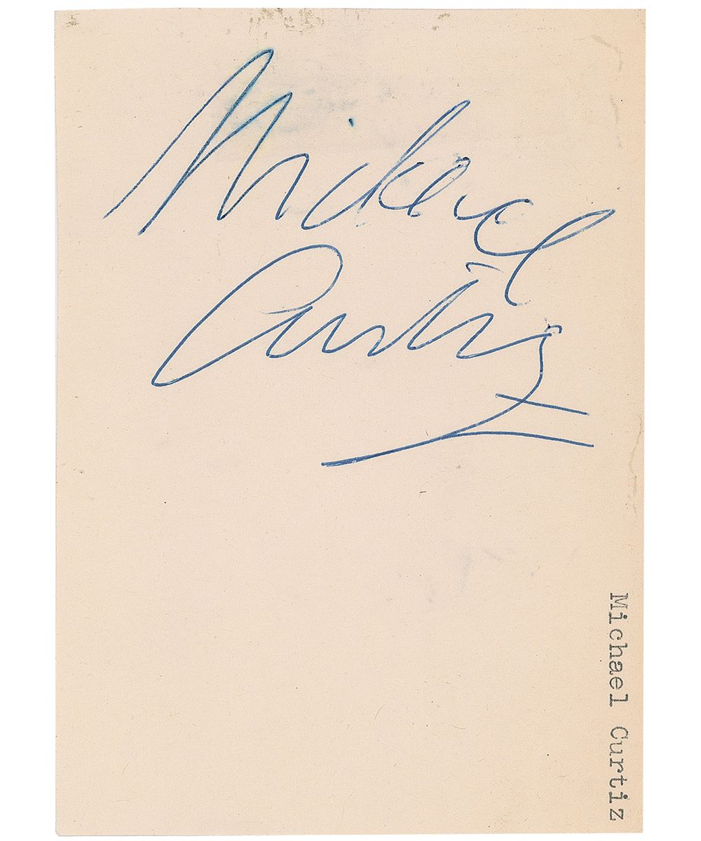 Distinguished Hungarian-born American film director (1886–1962) who helmed such all-time classics as Casablanca, Angels with Dirty Faces, Yankee Doodle Dandy, and White Christmas. Nominated four times for an Academy Award as Best Director, he won the Oscar for Casablanca. Vintage ballpoint signature, “Michael Curtiz,” on an off-white 5 x 3.5 slip with a typed notation in the upper right. In fine condition, with a few creases to top, light soiling to left side, and some show-through from mounting remnants on reverse.