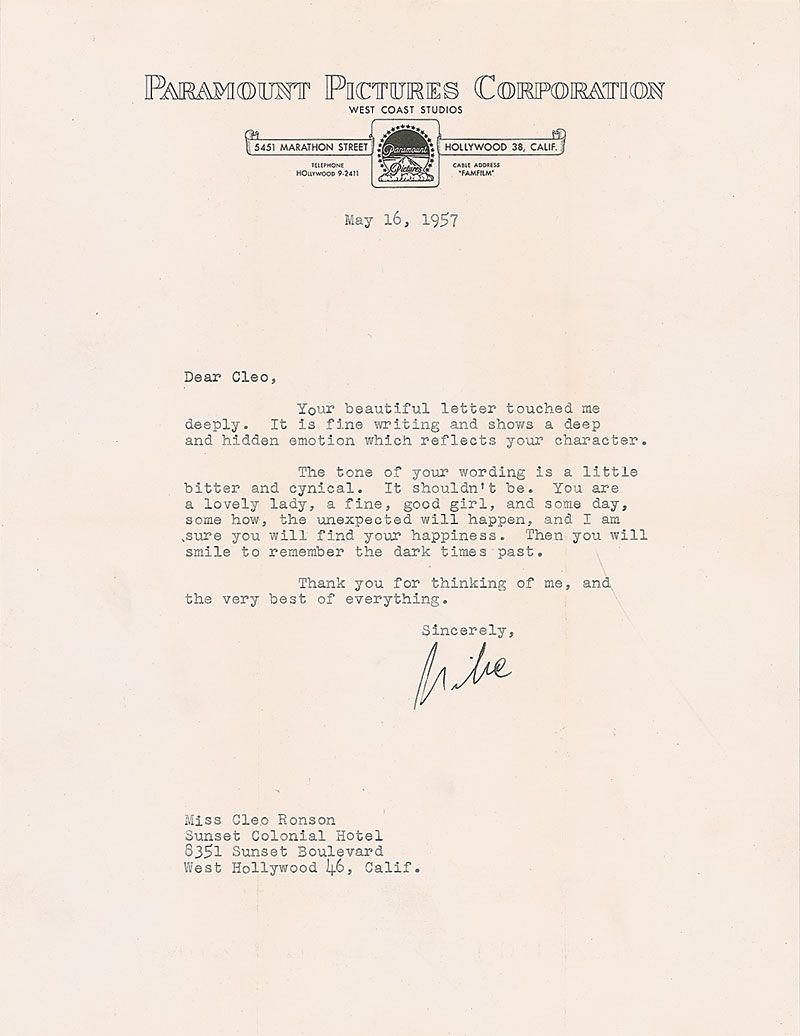 Distinguished Hungarian-born American film director (1886–1962) who helmed such all-time classics as Casablanca, Angels with Dirty Faces, Yankee Doodle Dandy, and White Christmas. Nominated four times for an Academy Award as Best Director, he won the Oscar for Casablanca. TLS signed “Mike,” one page, 8.5 x 11, Paramount Pictures Corporation letterhead, May 16, 1957. Letter to an admirer. In part: “Your beautiful letter touched me deeply. It is fine writing and shows a deep and hidden emotion which reflects your character. The tone of your wording is a little bitter and cynical. It shouldn’t be. You are a lovely lady, a fine, good girl, and some day, some how, the unexpected will happen, and I am sure you will find your happiness. Then you will smile to remember the dark times past.” In fine condition, with intersecting folds.