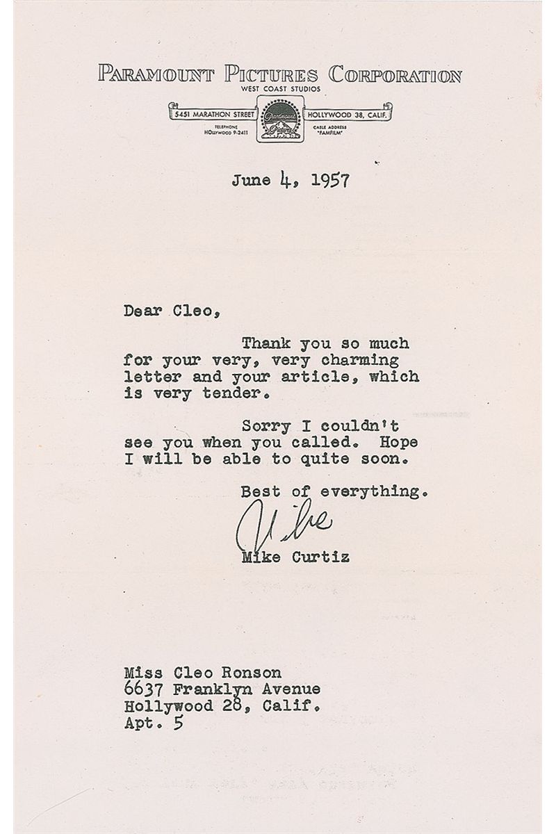 TLS signed “Mike,” one page, 5.25 x 8.5, Paramount Pictures Corporation letterhead, June 4, 1957. Letter of thanks to Cleo Ronson. In full: “Thank you very much for your very, very charming letter and your article, which is very tender. Sorry I couldn’t see you when you called. Hope I will be able to quite soon.” In fine condition. Accompanied by the original mailing envelope.
