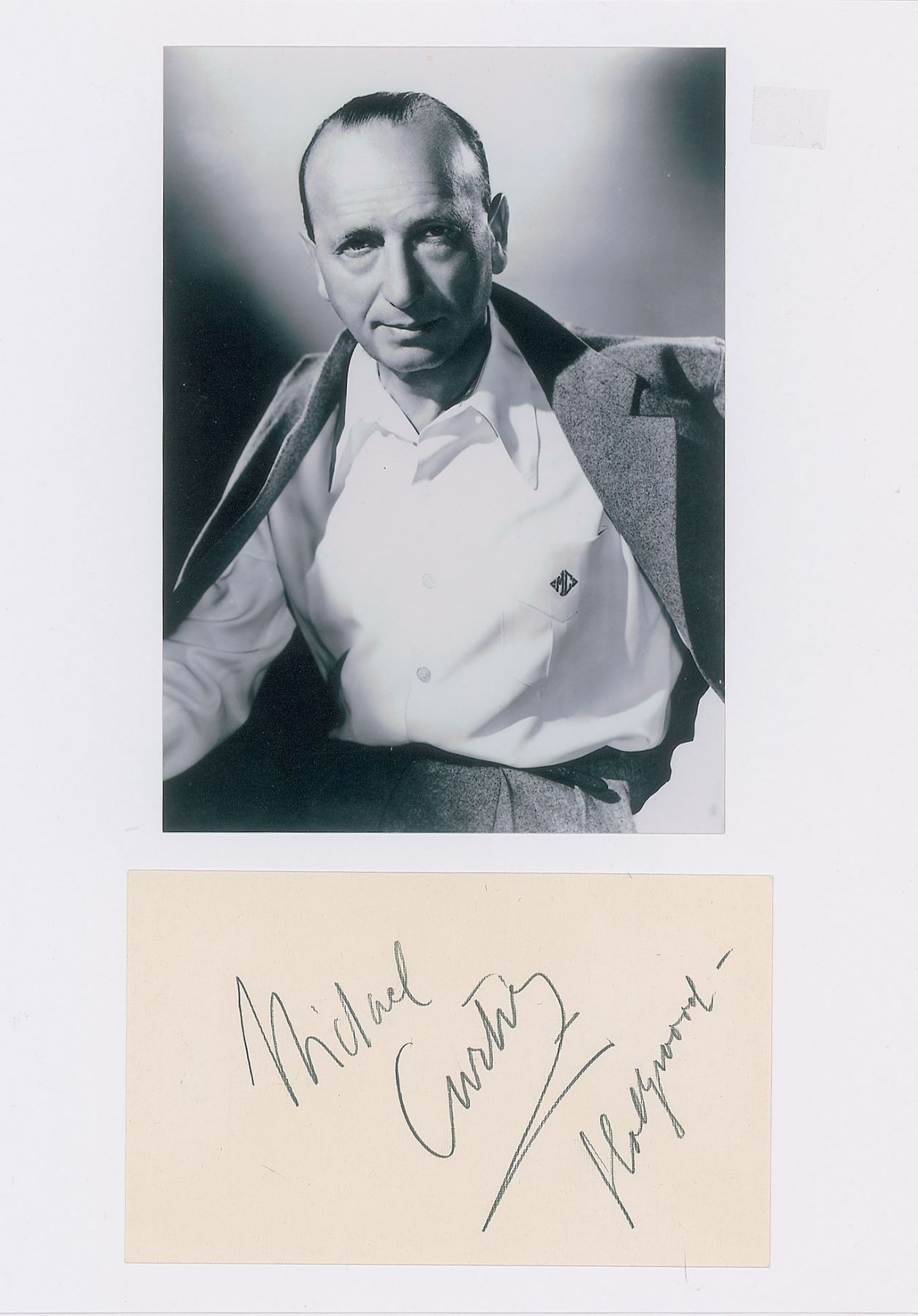 Vintage pencil signature, "Michael Curtiz, Hollywood,” on an off-white 5.75 x 3.5 card, affixed below a portrait to an overall size of 8.25 x 11.75. In fine condition.