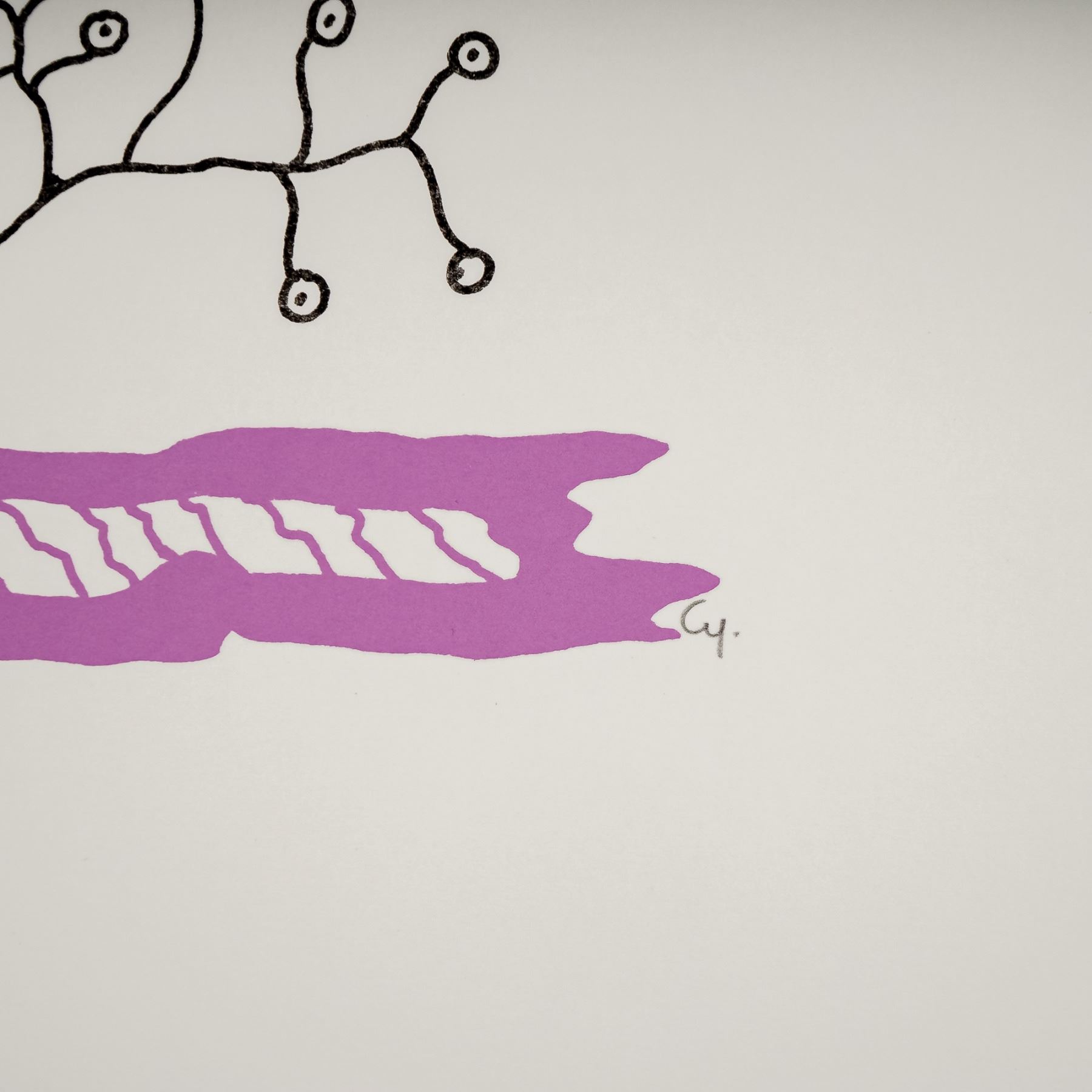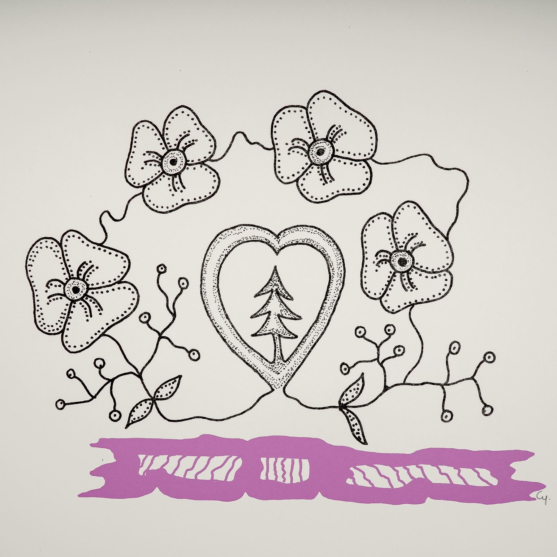 Michael Cywink (Canadian, b. 1958), Springtime, limited-edition screenprint in colors on wove paper, signed "Cy." at lower right and numbered 33/300 in pencil at lower left; the composition features Cywink's characteristic dotted black linework, orchid-like blooms and berrying stems encircling a heart that frames a spruce, set above a vivid mauve ground motif, a gentle, graphic celebration of renewal and Anishinaabe storytelling forms. The sheet is bright and clean with strong impressions; in very good overall condition with only light, routine handling and a few tiny stray specks noted on the field on close inspection. Unframed. A fine, early multiple by the noted Indigenous artist and storyteller.