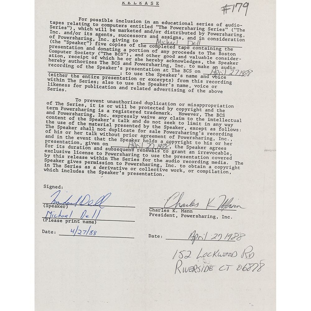 DS, one page, 8.5 x 11, April 27, 1988. Dell consents to the release of his lecture, 'PCs Limited: The Dell Computer Company,' given before the Boston Computer Society on April 27, 1988, as part of Charles Mann's "educational series of audiotapes relating to computers entitled 'The Powersharing Series.'" Signed at the conclusion in blue ballpoint by Dell, printing his name and writing the date below. Countersigned in ink by Mann. In fine condition.