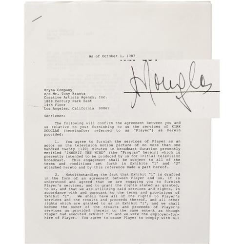 <B>Michael Douglas Signed Agreement.</B></I> A four-page agreement dated October 1, 1987, furnishing the services of Kirk Douglas as an actor in a television production of <I>Inherit the Wind,</B></I> signed in black ink on the last page by Michael Douglas on behalf of his father. In Excellent condition with minor wear and tanning, and a rusty paper clip mark on the left edge of the front age. <I>Accompanied by LOA from PSA/DNA.</B></I><BR><BR><b>Shipping:</b> Small Flat (<a target="_blank" href="http://www.heritageauctions.com/common/shipping.php">view shipping information</a>)