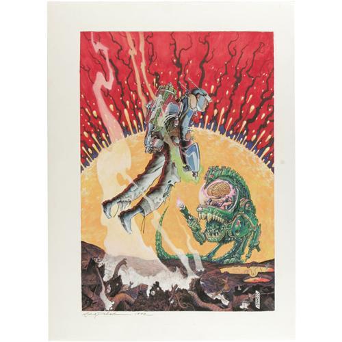 <B>Michael Dubisch - "Alive at the Edge" Illustration Original Art (1992).</B></I> A super hero and super villain duke it out before an exploding sun, in this incredible illustration originally published in <B>Art?Alternatives </B></I>#8 in the article "100% Organic Ecstasy: The Million Tentacles of Mike Dubisch." Published as a print by PODgallery, this illo also appears in <B>Morbid Curiosity: The Art of Mike Dubisch</B></I>. Rendered in mixed media on heavy paper, the image area measures 11" x 16". In Excellent condition, and signed by Michael Dubisch at the lower left.<BR><BR><b>Shipping:</b> Flat Material, Large (<a target="_blank" href="http://www.heritageauctions.com/common/shipping.php">view shipping information</a>)