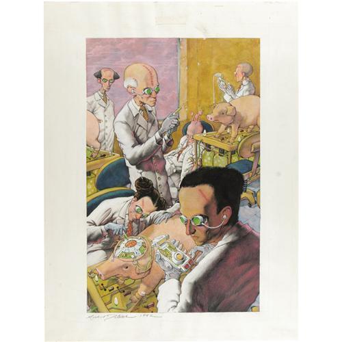 <B>Michael Dubisch - "Pigs and Science" Illustration Original Art (1992).</B></I> Mad scientists experiment on cyborg swine, in this illustration which originally appeared in <B>Portfolio</B></I> #8, published by Visual Art Press. It was also published in <B>Art?Alternatives</B></I> #8 (1996) in the article "100% Organic Ecstasy: The Million Tentacles of Mike Dubisch," as a print by PODgallery, and in <B>Morbid Curiosity: The Art of Mike Dubisch</B></I>. Rendered in mixed media on heavy paper, the image area measures 10" x 16". In Excellent condition, and signed by Michael Dubisch at the lower left.<BR><BR><b>Shipping:</b> Flat Material, Large (<a target="_blank" href="http://www.heritageauctions.com/common/shipping.php">view shipping information</a>)