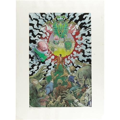 <B>Michael Dubisch - "Zombies and Aliens" Illustration Original Art (1992).</B></I> Zombies and aliens -- what more could a horror fan-addict ask for? This piece was published as a print through PODgallery, and also appears in black and white on pages 53 and 54 of <B>Morbid Curiosity, The Art of Mike Dubisch</B></I>. This mixed-media on paper spine-tingler has an image area of 10.25" x 15.5", and the art is in Excellent condition.<BR><BR><b>Shipping:</b> Flat Material, Large (<a target="_blank" href="http://www.heritageauctions.com/common/shipping.php">view shipping information</a>)