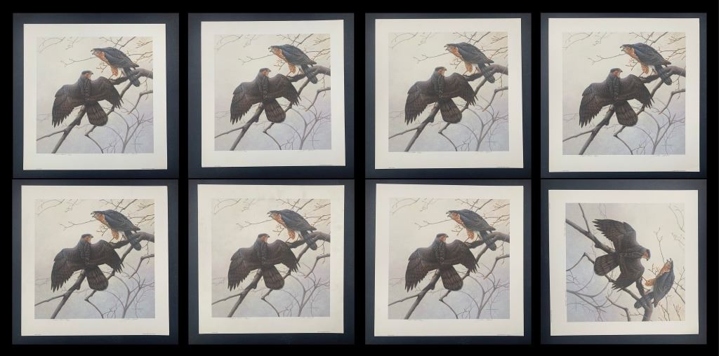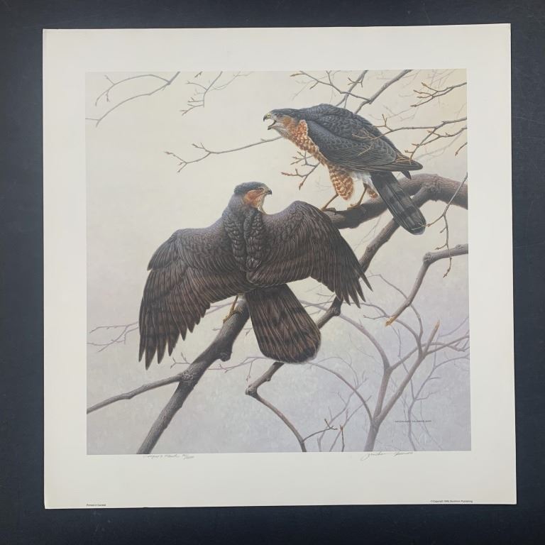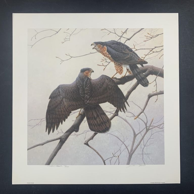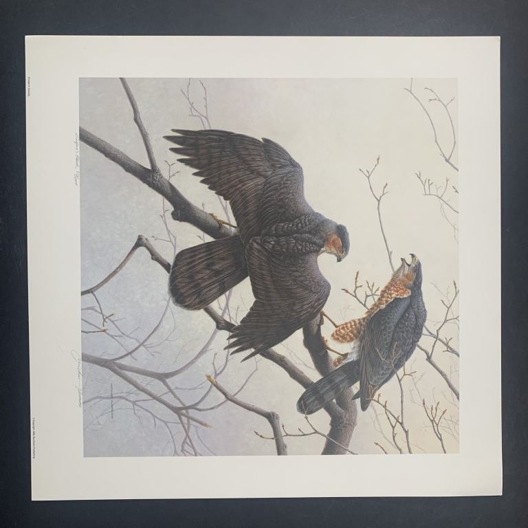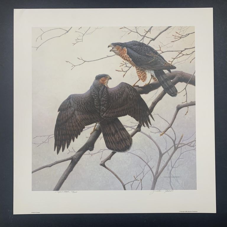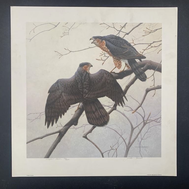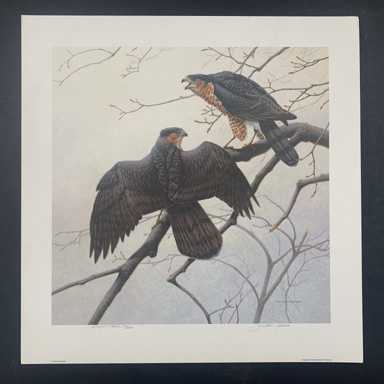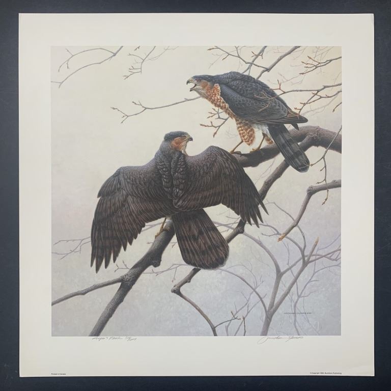 Michael Dumas's "Cooper's Hawk" limited edition print, signed lower right and numbered of an edition size of 1000 lower left. There are 8 prints in total, each in excellent condition. This piece is of two hawks perched on a branch, high in a tree. This piece is in excellent condition.