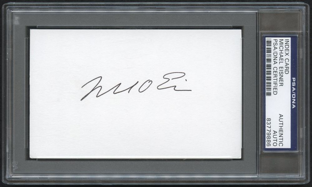 Cut measures 3" x 5" and has been hand-signed in black ink pen by Michael Eisner. The autograph has been encapsulated by PSA for authenticity purposes.
