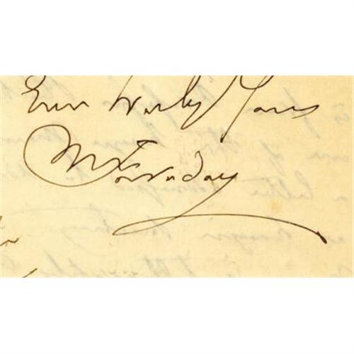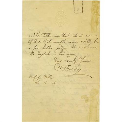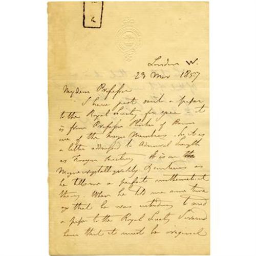 <B>Michael Faraday Autograph Letter Signed</B></I> “<I>M. Faraday,</B></I>” two pages, 4.5” x 7”, front and verso. London, March 23, 1857. To Professor Miller. On embossed “<I>Royal Institution of Great Britain</B></I>” stationery. In full, “<I>I have just sent a paper to the Royal Society for you - it is from Professor Plucker of Bonn…it is on magnecrystal quality & contains as he tells me a perfect mathematical theory. When he told me some time ago that he was intending to send a paper to the Royal Society I warned him that it must be original and he tells me that it is so - Of that & its merits you will be a far better judge than I am…</B></I>” Julius Plücker (1801-1868) was a German mathematician and physicist. In 1858, he published a paper on the action of the magnet on the electric discharge in rarefied gases. English chemist and physicist Michael Faraday (1791-1867) established the basis for the magnetic field concept in physics. Light stains in blank areas on second page. Small rectangular clip stain in upper blank margin on both sides. Fine condition.<BR><BR><b>Shipping:</b> Books & Catalogs (<a target="_blank" href="http://www.heritageauctions.com/common/shipping.php">view shipping information</a>)