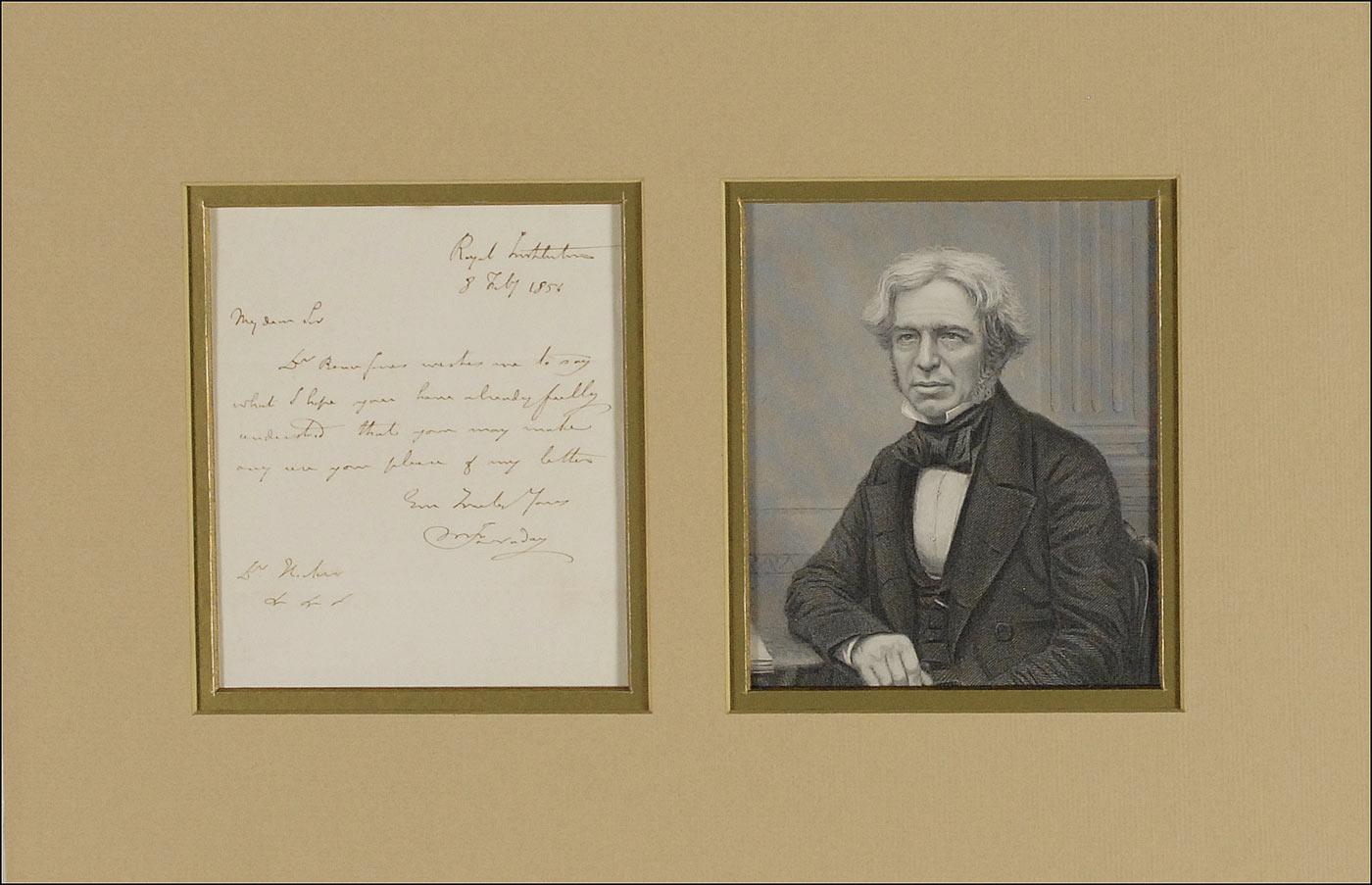 British physicist and chemist (1791–1867) best known for his development of the first dynamo and the discovery of electromagnetic induction. ALS signed “M. Faraday,” one page, 4.25 x 5, February 8, 1856. Letter to a doctor. In part: “Dr.…wishes me to say what I hope you already have fully understood that you may make any use you please of my letter.” Double matted with an engraved portrait to an overall size of 14 x 9.5. In fine condition, with a bit of scattered light soiling. Faraday is scarce in any form.