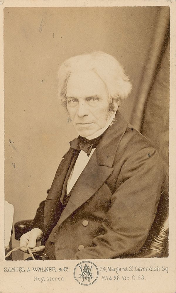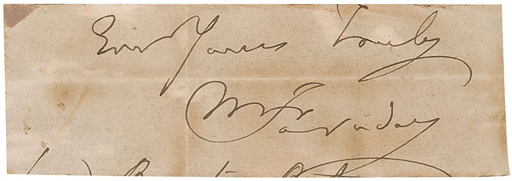 British physicist and chemist (1791–1867) best known for his development of the first dynamo and the discovery of electromagnetic induction. Ink signature, “Ever Yours truly, M. Faraday,” on an off-white 3.25 x 1 slip. In very good condition, with intersecting folds, one through a single letter of signature, and scattered moderate toning and soiling. Accompanied by an unsigned carte-de-visite of Faraday.