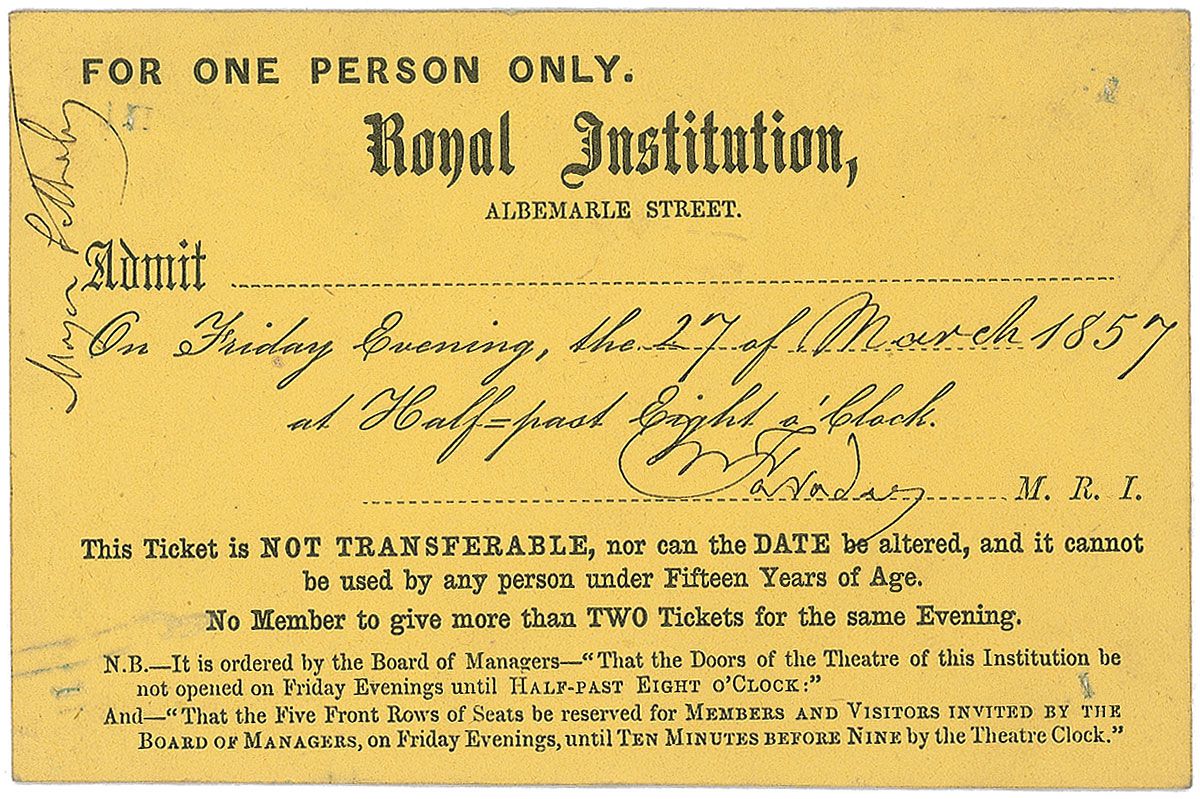 British physicist and chemist (1791–1867) best known for his development of the first dynamo and the discovery of electromagnetic induction; he was appointed as the Fullerian Professor of Chemistry at the Royal Institution in 1825, a lifetime position. Ticket for a lecture at the Royal Institution on March 27, 1857, 4.5 x 3, signed in black ink by Faraday, “M. Faraday.” In fine condition, with a couple insignificant tack holes to corners and a few surface marks. Though the subject for this particular lecture is unknown, Faraday was a charismatic and engaging lecturer, and he initiated the immensely popular ‘Christmas Lecture’ series, which was designed to excite the general population about science with impressive demonstrations and understandable instruction—a tradition that continues to this day.
