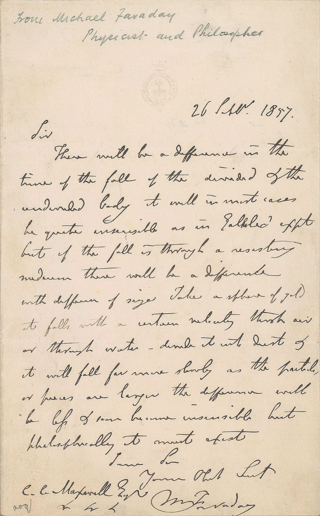 Galielo's famous experiment disproved Aristotle's theory of gravity (which said that heavy objects fall faster than lighter ones) and it remains one of the most well-known demonstrations in history. The results helped to usher in the era of modern science. As one of the most revered scientists of the 19th century, Faraday was familiar with Galileo's great experiment and his thoughts on the subject are truly spectacular. He observes that the results hold true only when there is no resistance—ideally, the demonstration would take place in a vacuum. This experiment was famously recreated on the surface of the moon in 1971 by astronaut Dave Scott, dropping a hammer and feather at the same time—given the lack of air resistance, they indeed landed simultaneously. An amazing letter connecting science across the ages.