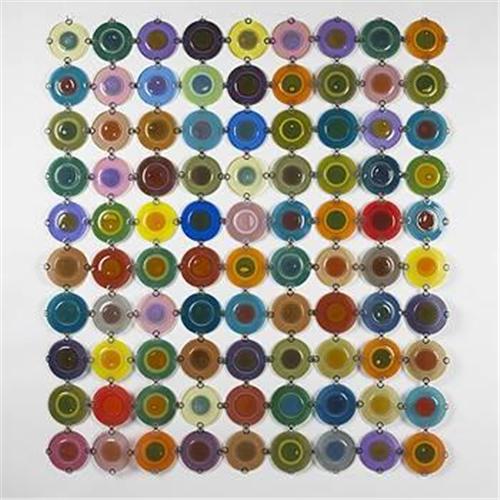 Michael & Francis Higgins<BR>Rondelay screen<BR>Higgins Studio<BR>USA, 1950s<BR>fused glass, copper<BR>55"w x 49.5"h<BR>A large multi-color rondelay screen with ninety-six pieces total.<BR><BR><BR><BR><BR>