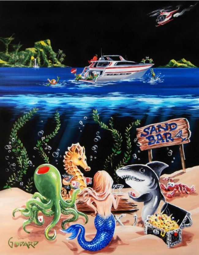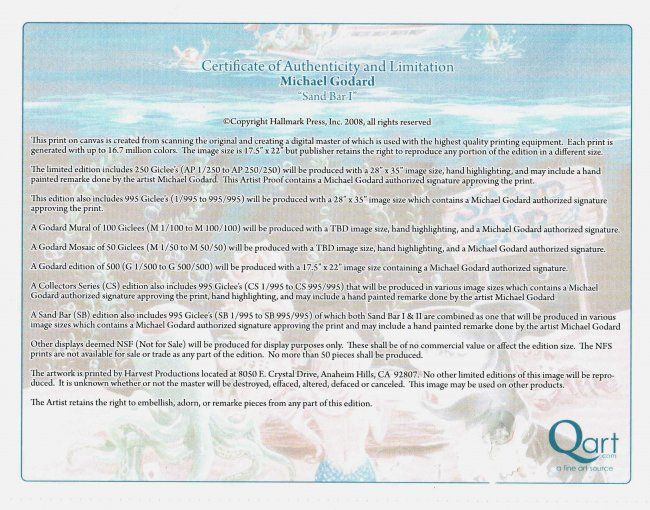 Michael Godard "Sand Bar I" Giclee on Canvas. Image Size: 28" x 35" Edition Size: 995(CS). Signed and numbered, comes with COA and unframed. Has small scratch on the corner. This piece is stretched and ready for framing. Due to Size, additional shipping charges may apply. W432