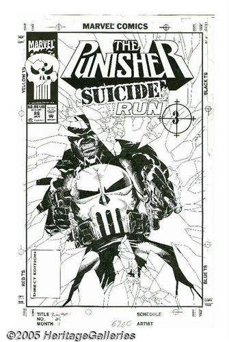 <B>Michael Golden - The Punisher #86 Cover Original Art (Marvel, 1994).</B></I> Like an angel of death, The Punisher deals justice from the smoking barrels of his two .45 caliber machine pistols. Frank Castle is in fine form in the hand of Michael Golden, whose highly detailed and lushly illustrated image covers this issue's "Suicide Run, part 3: Deadline," storyline, written by Steven Grant. The image area measures 10" x 15," and the art, which is in Excellent condition, includes the original logo and title type, and masthead paste-up art.