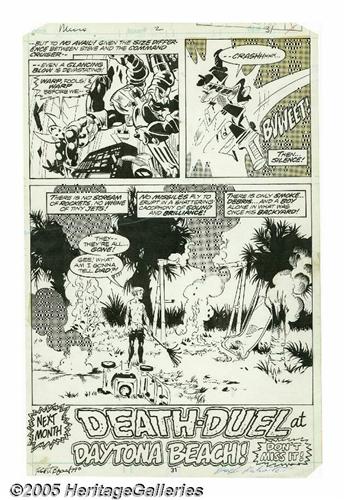 <B>Michael Golden and Joe Rubinstein - Micronauts #2, page 31 Original Art (Marvel, 1979).</B></I> Sometimes size really <I>does</B></I> matter! Two Battle Cruiser pilots find that out the hard way, in this page, penciled by the original series artist, Michael Golden, and inked by Joe Rubinstein. Having just recently landed on Earth, the 6-inch tall Micronauts befriend a boy, Steve Coffin, who now stands alone in what once was his backyard, in this final page from <B>Micronauts</B></I> #2. From the story "Earth," written by Bill Mantlo, comes this gorgeously rendered page, which has an image area of 10" x 15". There is some slight Zipatone aging, a blue-line editorial mark in the third panel, and some minimal staining, but overall the work is in Excellent condition. Signed by Joe Rubinstein at the bottom right.