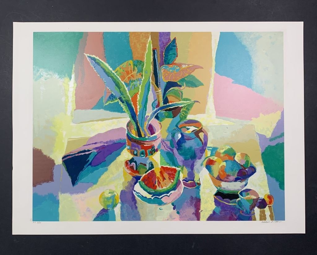 Michael Gorban's "Still Life With Fruit and Plants" limited edition artist proof print, signed lower right and and numbered 30/50 AP. This piece is of fruit and a potted plant on a table, done in Gorban's signature colourful style. This piece is in near excellent condition iwth a minor wrinkle at left edge, and a small dirt stain lower left in margin.