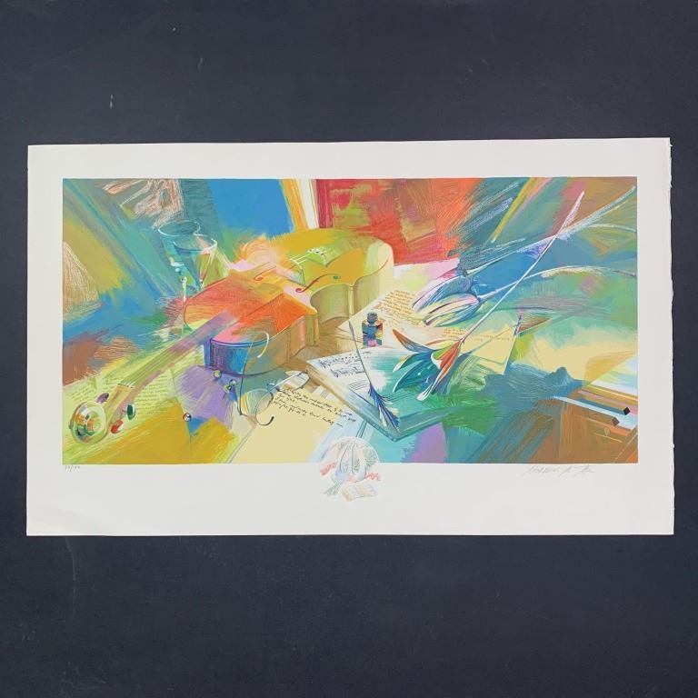 Michael Gorban's "Violin" limited edition print, signed lower right and numbered 55/150 lower left. This piece is of a violet and sheets of music, done in Gorban's signature colourfuly style. This piece is in excellent condition