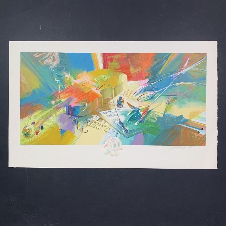 Michael Gorban's "Violin" limited edition print, signed lower right and numbered 52/150 lower left. This piece is of a violin and sheet music, done in Gorban's colourful style. This piece is in fair condition with a major crease/wrinkle lower left, and a small 10mm incision upper right.