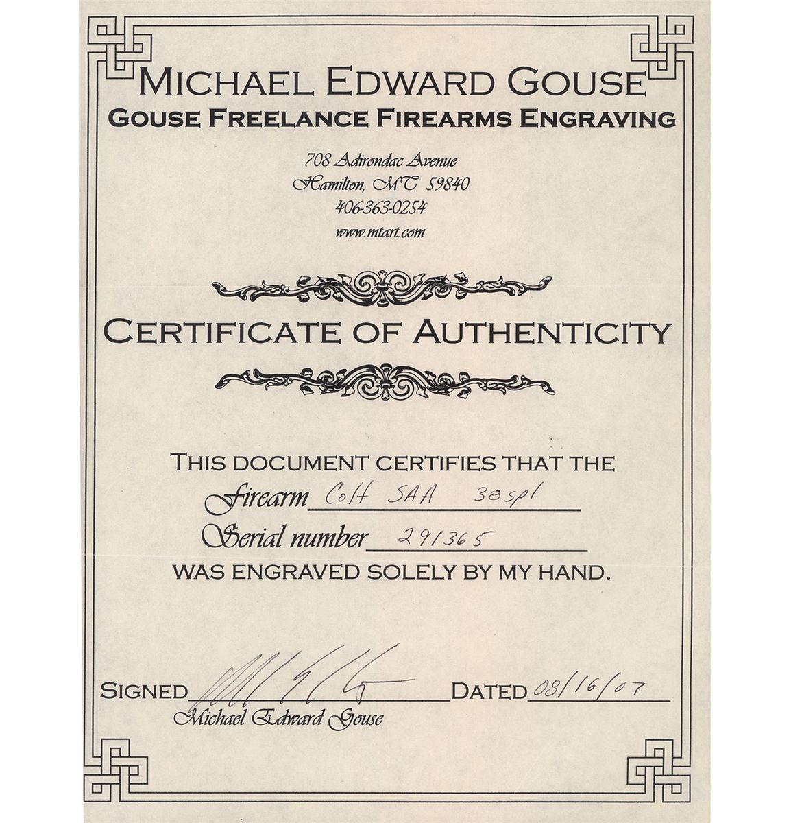 Manufactured in 1907. Factory letter states this revolver was shipped as 1 to Charles J. Godfrey Company, N.Y., N.Y. on April 5, 1907 and at the time had a 7 1/2" 44-40 caliber barrel, blue finish, grips as "Not Listed" and special feature "Light trigger pull". Features floral scroll and geometric engraving covering 80% of the gun. Also comes with a Certificate of Authenticity from Gouse Freelance Firearms Engraving verifying that Michael Gouse engraved this revolver.