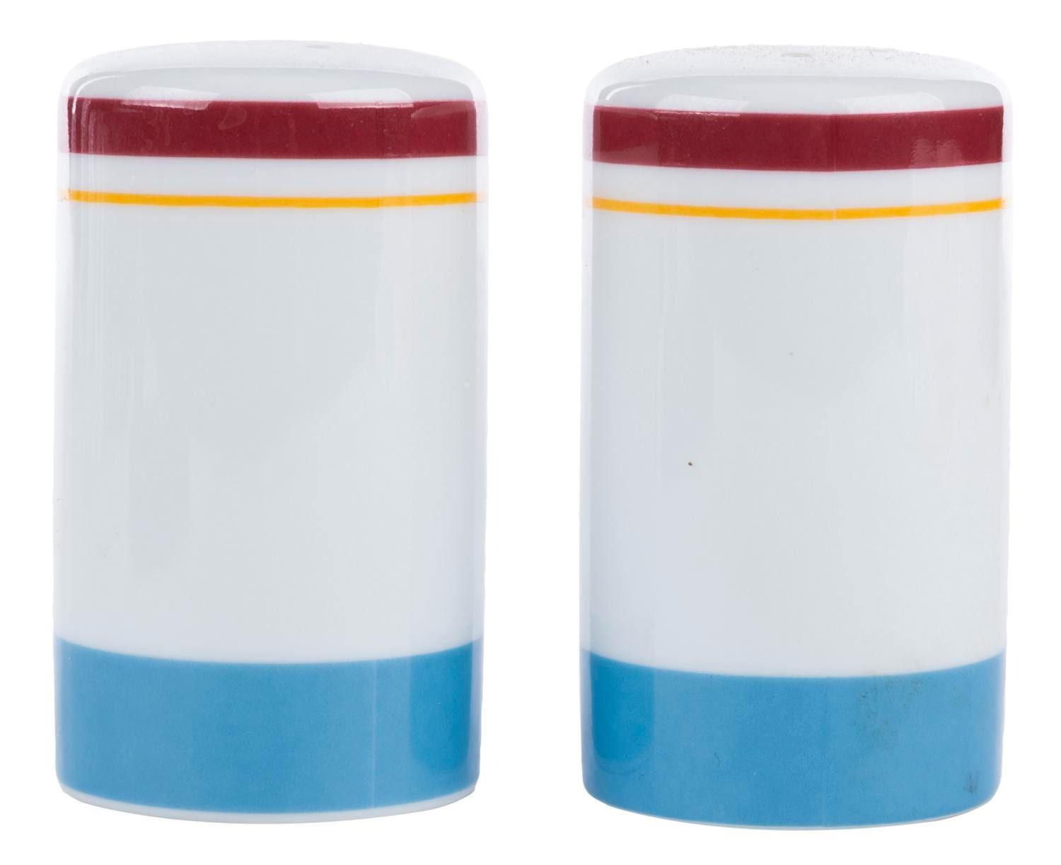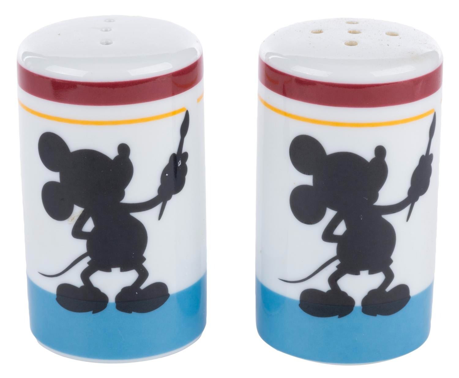 (Disney, 1990s) A replica Disney Studio Executive Dining Room Salt and Pepper Shaker Set. Architect Michael Graves designed this pattern for the Walt Disney Studio's Team Disney Building in Burbank. This pattern was available for purchase at the short-lived Walt Disney Galleries store in Santa Ana during the 1990s. Each measuring 1.75” diameter x 3” high, the shakers are in very good condition with light wear from use.