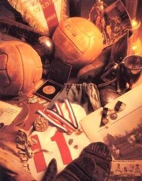 All the essentials of soccer appear in this timeless image, including some vintage medals.Artist: Michael HarrisonTitle: Soccer Medium: Print on paperPaper: 28 x 22Image: 28 x 22 Condition: Excellent