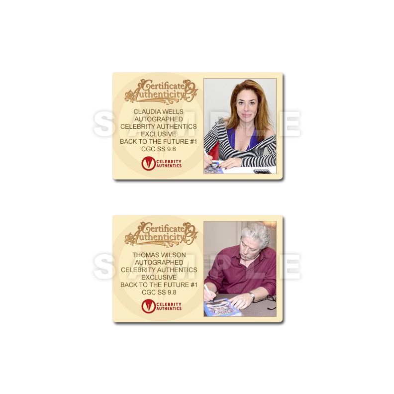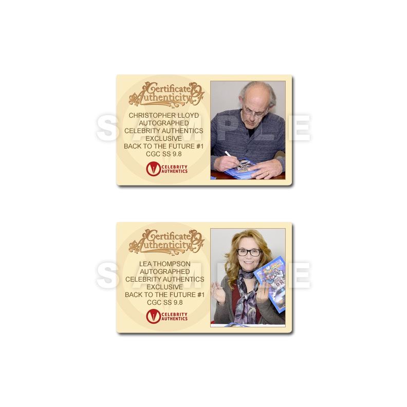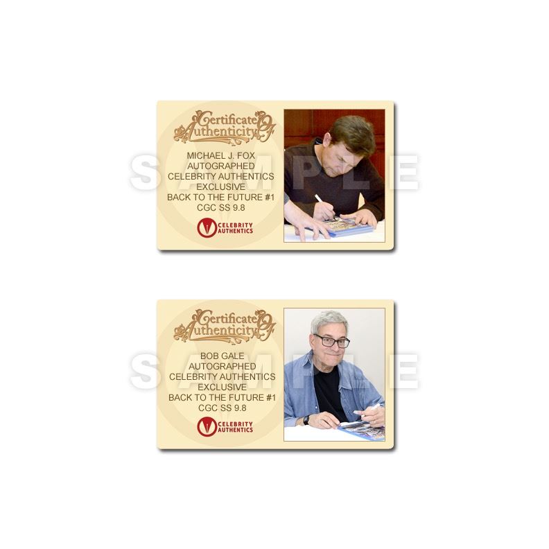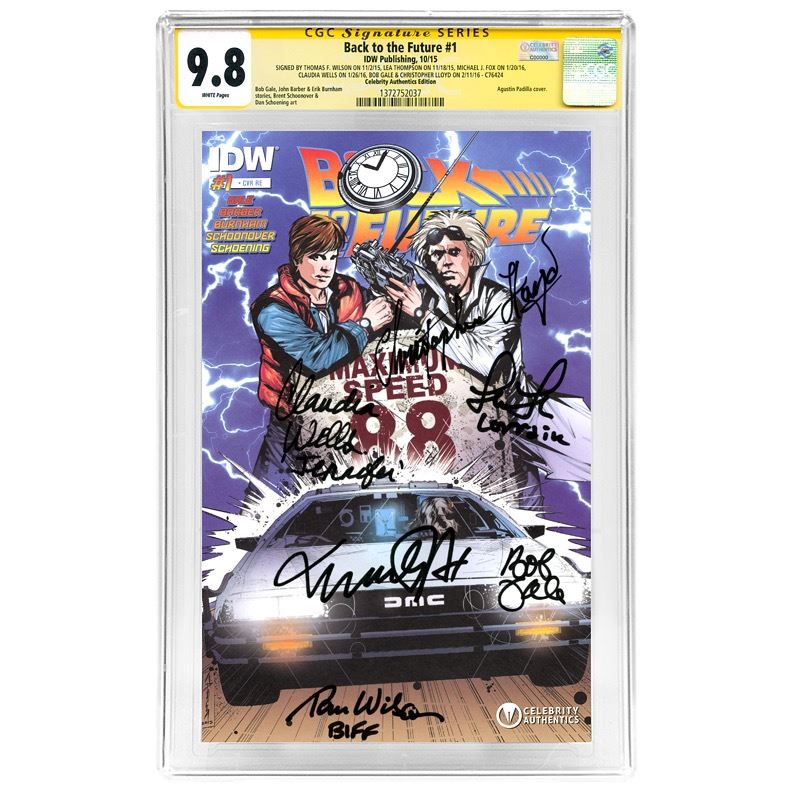 This Back to the Future #1 graded CGC Signature Series 9.8 (mint condition) with Celebrity Authentics Exclusive Cover has been personally hand signed by Michael J. Fox (Marty McFly), Christopher Lloyd (Doc Brown), Thomas Wilson (Biff Tannen), Lea Thompson (Lorraine Baines), Claudia Wells (Jennifer Parker) and Bob Gale (Writer/Producer) during their autograph signings with Celebrity Authentics. Case ships affixed with Celebrity Authentics serial-numbered and tamper evident Authentication Hologram and includes Celebrity Authentics Certificates of Authenticity featuring a picture of each signing the comic. Stock image used for product images. Item ships with clean, unsmudged autograph in similar location.