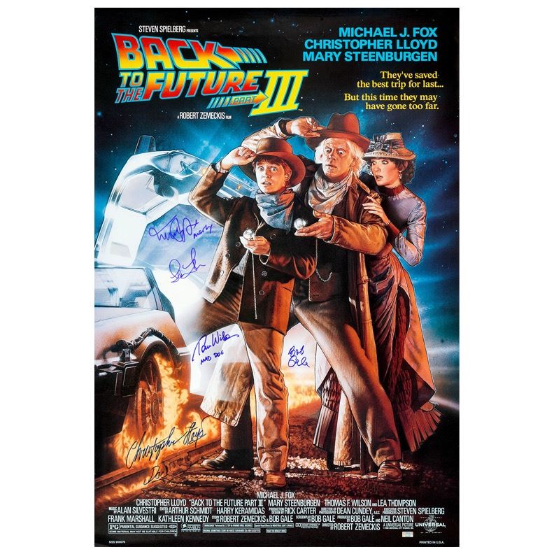 This Back to the Future Part III 27x40 Movie Poster has been personally hand-signed by Michael J. Fox (Marty McFly), Christopher Lloyd (Doc Brown), Thomas Wilson (Mad Dog), Lea Thompson (Maggie) and writer Bob Gale during their signings with Celebrity Authentics. Doc and Marty travel farther back in time than ever before in this time traveling comedy set in the old west. Poster is an officially licensed, high quality reproduction with original hand-signed autographs and ships affixed with a Celebrity Authentics serial-numbered and tamper evident Authentication Hologram and includes Celebrity Authentics Certificates of Authenticity featuring a picture each actor signing the poster. Please note, due to their packaging, to help ensure their safe delivery we are unable to combine posters with other items. Stock image used for product images. Item ships with clean, unsmudged autograph in similar location.