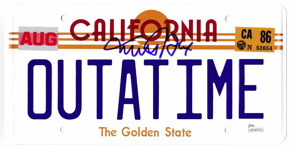 Michael J. Fox signed Back To The Future California 'OUTATIME' Delorean replica license plate. Item comes with a JSA (James Spence Authentication) tamper evident numbered sticker and matching Certificate of Authenticity which can be verified online.