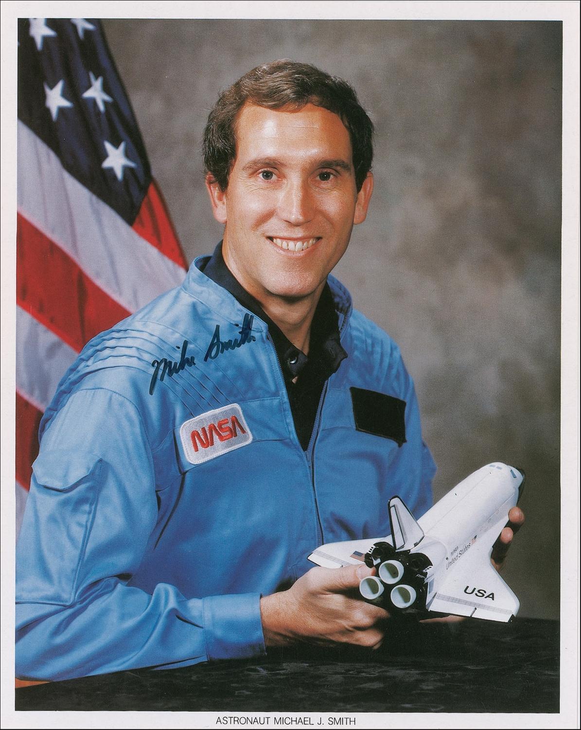 Color 8 x 10 NASA photo of Challenger pilot Michael Smith in his blue flight suit and holding a model of the spacecraft, signed in black felt tip, “Mike Smith.” In fine condition.