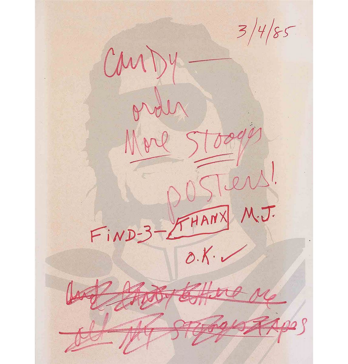 ANS signed “M. J.,” one page, 8.5 x 11, on attractive watermarked Michael Jackson personal letterhead, March 4, 1985. Short note to an assistant named “Candy.” In full: “Order more Stooges posters! Find–3–Thanx.” Jackson has also crossed out two lines of text along the bottom, which reads: “And Candy where are all my Stooges tapes.” In fine condition, with a uniform shade of very mild toning from previous display. A rare content piece as it relates to the King of Pop and his clear expression of interest in the iconic comedic celebrities—The Three Stooges.
