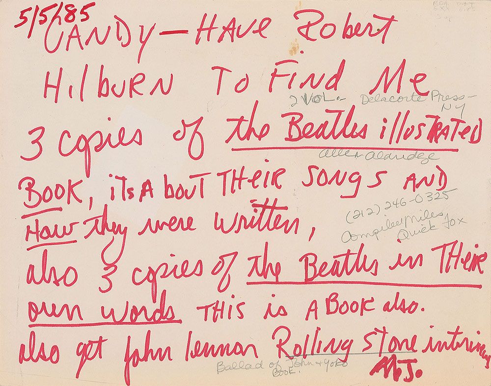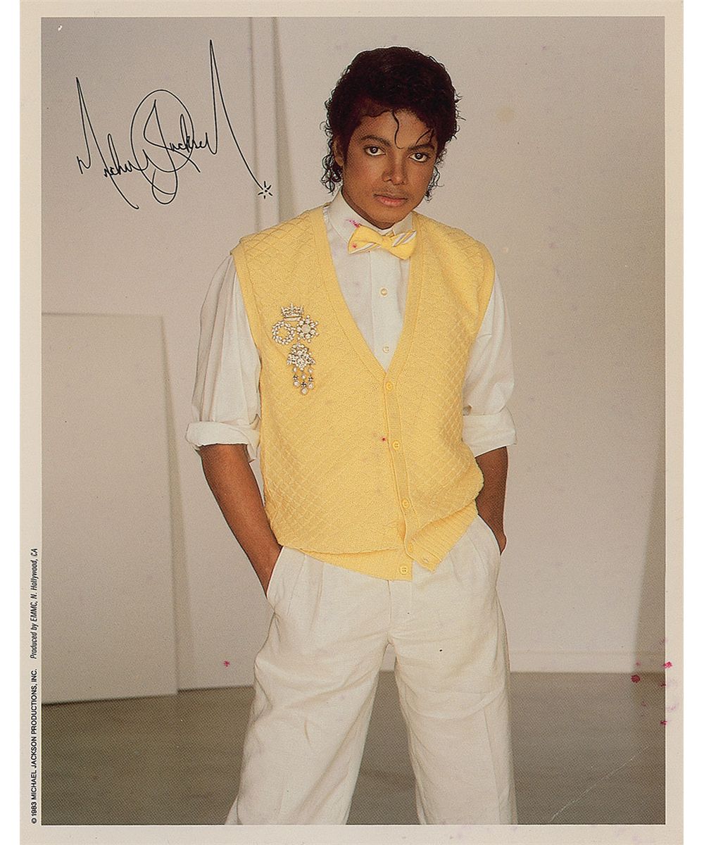 Rare ANS signed “M. J.,” on the reverse of a 10 x 8 color cardstock personal publicity photo, May 5, 1985. Notes of historical significance, to an assistant named “Candy.” In full (with grammar and spelling retained): “Have Robert Hilburn to find me 3 copies of the Beatles Illustrated Book, its about their songs and how they were written, also 3 copies of the Beatles in their own words this is a book also. Also get John lennon Rolling Stone interview.” There are also several pencil notations Candy’s hand, as Michael Jackson’s assistant. In fine condition, with scattered light toning, a few creases, and a small spot near top, not particularly detracting from the integrity of this historical piece from the King of Pop. Jackson had spent the past year in negotiations to acquire the publishing rights to ATV Music Publishing, which included the majority of the Beatles’ songs. He finally bought the rights in August of 1985 for a price of $47.5 million dollars. In 1997, Jackson licensed the song ‘Revolution’ to Nike for $500,000, infuriating McCartney. An impressive piece of musical history, bringing together the King of Pop and the Fab Four.