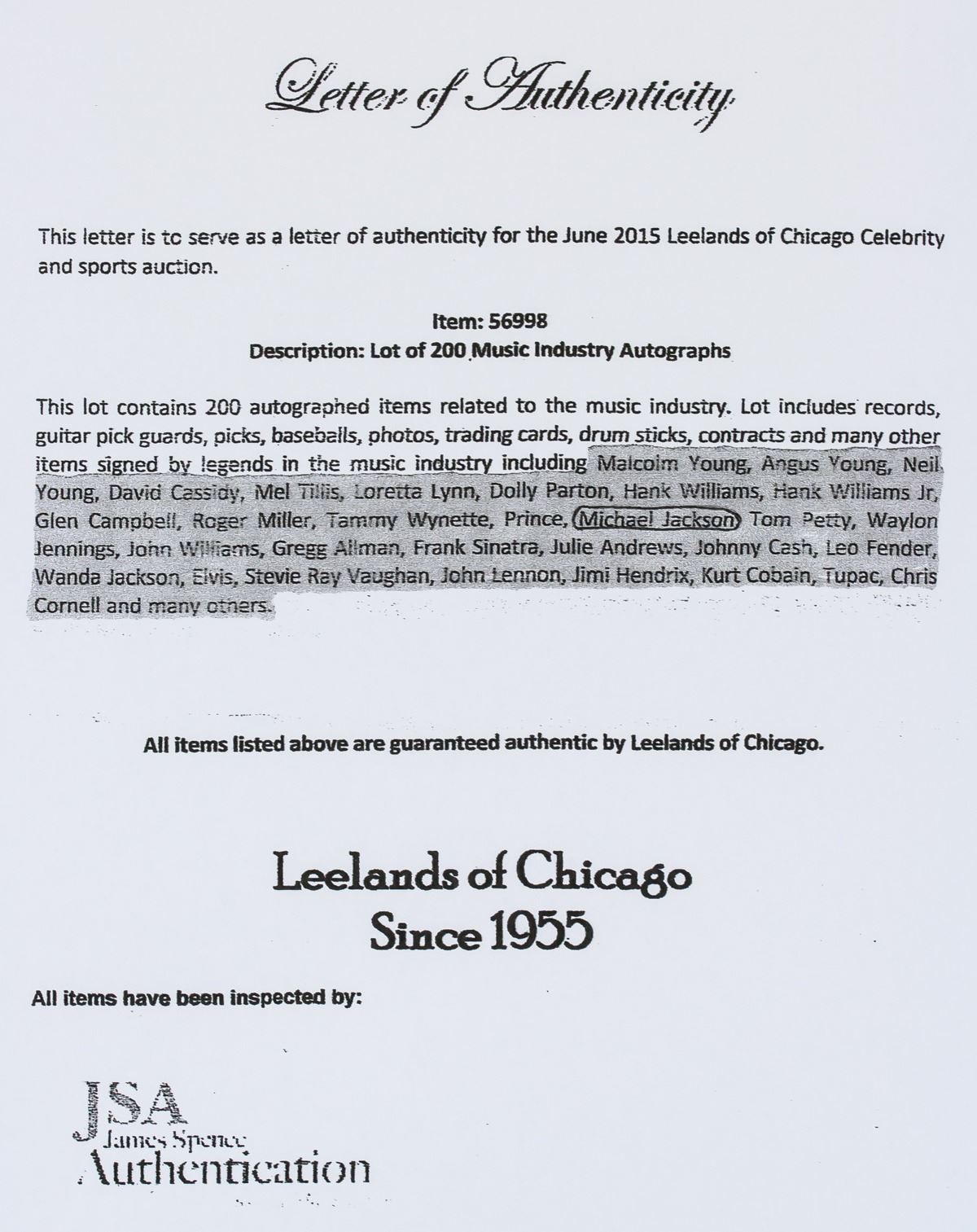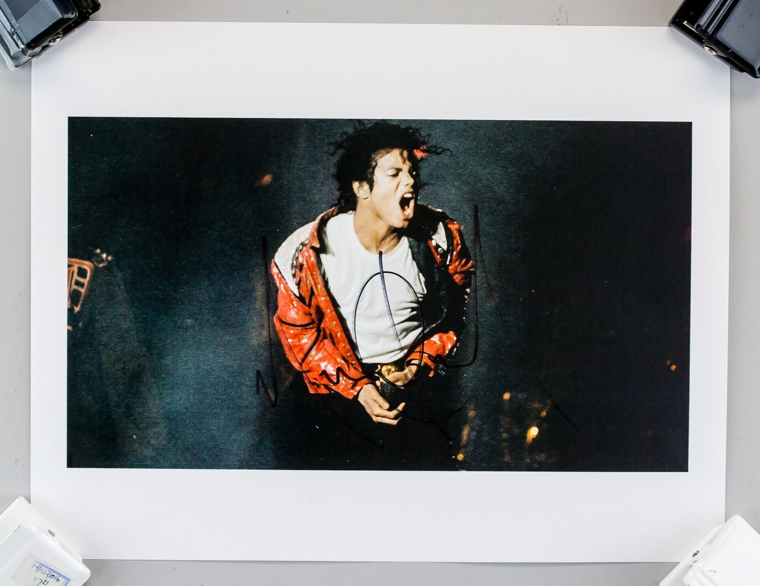 Autographed photograph, signed Michael Jackson (1958-2009, American). Accompanied with a James Spence Authentication JSA Letter of Authenticity. 14 x 25 cm (5.5 x 9.8 inches)