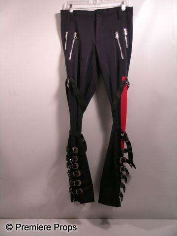Attention Michael Jackson fans and impersonators. This is a pair of pants that were worn by a Michael Jackson impersonator, reminiscent of the pants worn for his 'Bad' music video. The pants are made from a black polyester material, with four zippered front pockets, a red stripe running down the left pant leg, and has numerous chains and buckles on both pant legs, near the calves. (size approx. S/XS)