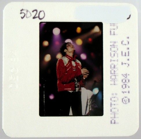 Michael Jackson in almost orgasmic bliss after finishing a song in concert circa 1980. These photos were commission by Joe Jackson, father, founder and early manager of his children, Michael Jackson and the Jackson 5. He hired the top music concert photographers of the day to take pictures of Michael Jackson and the Jackson Five (both in individual performances and as a group), while they were on tour, and during personal appearances, as well as at family get-together's. The purchase of this photo includes the original transparency, and includes a full copyright release for your own personal unlimited reproduction printing and selling to the winning bidder. They are the original 35 millimeter film used to take the picture, and are professionally mounted in “slide” paper for protection. The original film sprockets can be seen when the paper is removed. The color reversal film was used by these photographers, because, as is standard in the industry, this film stock creates more detailed images especially in Concert and low-light situations, and in many ways is actually superior to color negative film stock for reproduction purposes. Bidders are advised that Jackson Entertainment Corp. and the Estate of Michael Jackson have asserted a claim that they are the owners of the copyright in this photo and/or rights to the reproduction of Michael Jackson’s image. Bidders are advised that all proceeds from sales and delivery of the purchased items will be held by Premiere Props in escrow pending resolution of these claims unless the successful bidders assume the risk.