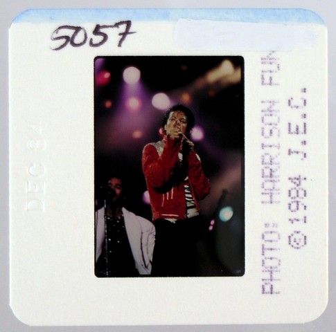 Michael Jackson "telling" his audience and 'teaching them a thing or two" while performing in concert circa 1980. These photos were commission by Joe Jackson, father, founder and early manager of his children, Michael Jackson and the Jackson 5. He hired the top music concert photographers of the day to take pictures of Michael Jackson and the Jackson Five (both in individual performances and as a group), while they were on tour, and during personal appearances, as well as at family get-together's. The purchase of this photo includes the original transparency, and includes a full copyright release for your own personal unlimited reproduction printing and selling to the winning bidder. They are the original 35 millimeter film used to take the picture, and are professionally mounted in “slide” paper for protection. The original film sprockets can be seen when the paper is removed. The color reversal film was used by these photographers, because, as is standard in the industry, this film stock creates more detailed images especially in Concert and low-light situations, and in many ways is actually superior to color negative film stock for reproduction purposes. Bidders are advised that Jackson Entertainment Corp. and the Estate of Michael Jackson have asserted a claim that they are the owners of the copyright in this photo and/or rights to the reproduction of Michael Jackson’s image. Bidders are advised that all proceeds from sales and delivery of the purchased items will be held by Premiere Props in escrow pending resolution of these claims unless the successful bidders assume the risk.