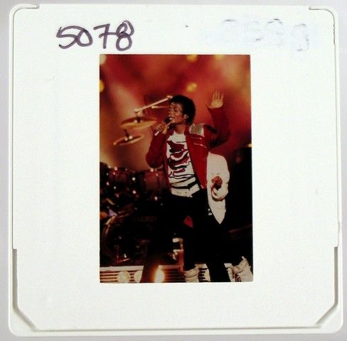 A dramatic photo that captures beautifully the magic in his eyes that seduced the world during a solo tour circa 1980. These photos were commission by Joe Jackson, father, founder and early manager of his children, Michael Jackson and the Jackson 5. He hired the top music concert photographers of the day to take pictures of Michael Jackson and the Jackson Five (both in individual performances and as a group), while they were on tour, and during personal appearances, as well as at family get-together's. The purchase of this photo includes the original transparency, and includes a full copyright release for your own personal unlimited reproduction printing and selling to the winning bidder. They are the original 35 millimeter film used to take the picture, and are professionally mounted in “slide” paper for protection. The original film sprockets can be seen when the paper is removed. The color reversal film was used by these photographers, because, as is standard in the industry, this film stock creates more detailed images especially in Concert and low-light situations, and in many ways is actually superior to color negative film stock for reproduction purposes. Bidders are advised that Jackson Entertainment Corp. and the Estate of Michael Jackson have asserted a claim that they are the owners of the copyright in this photo and/or rights to the reproduction of Michael Jackson’s image. Bidders are advised that all proceeds from sales and delivery of the purchased items will be held by Premiere Props in escrow pending resolution of these claims unless the successful bidders assume the risk.