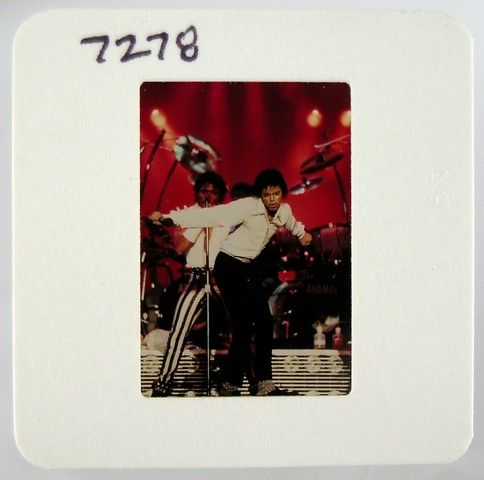 A young Michael Jackson about to begin an early rendition of the Moon Walk on his Victory Tour circa 1983. These photos were commission by Joe Jackson, father, founder and early manager of his children, Michael Jackson and the Jackson 5. He hired the top music concert photographers of the day to take pictures of Michael Jackson and the Jackson Five (both in individual performances and as a group), while they were on tour, and during personal appearances, as well as at family get-together's. The purchase of this photo includes the original transparency, and includes a full copyright release for your own personal unlimited reproduction printing and selling to the winning bidder. They are the original 35 millimeter film used to take the picture, and are professionally mounted in “slide” paper for protection. The original film sprockets can be seen when the paper is removed. The color reversal film was used by these photographers, because, as is standard in the industry, this film stock creates more detailed images especially in Concert and low-light situations, and in many ways is actually superior to color negative film stock for reproduction purposes. Bidders are advised that Jackson Entertainment Corp. and the Estate of Michael Jackson have asserted a claim that they are the owners of the copyright in this photo and/or rights to the reproduction of Michael Jackson’s image. Bidders are advised that all proceeds from sales and delivery of the purchased items will be held by Premiere Props in escrow pending resolution of these claims unless the successful bidders assume the risk.