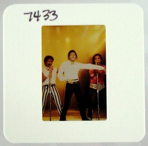 Michael Jackson beginning one of his most famous moves and dance routines with "back-up" on stage, circa 1982. These photos were commission by Joe Jackson, father, founder and early manager of his children, Michael Jackson and the Jackson 5. He hired the top music concert photographers of the day to take pictures of Michael Jackson and the Jackson Five (both in individual performances and as a group), while they were on tour, and during personal appearances, as well as at family get-together's. The purchase of this photo includes the original transparency, and includes a full copyright release for your own personal unlimited reproduction printing and selling to the winning bidder. They are the original 35 millimeter film used to take the picture, and are professionally mounted in “slide” paper for protection. The original film sprockets can be seen when the paper is removed. The color reversal film was used by these photographers, because, as is standard in the industry, this film stock creates more detailed images especially in Concert and low-light situations, and in many ways is actually superior to color negative film stock for reproduction purposes. Bidders are advised that Jackson Entertainment Corp. and the Estate of Michael Jackson have asserted a claim that they are the owners of the copyright in this photo and/or rights to the reproduction of Michael Jackson’s image. Bidders are advised that all proceeds from sales and delivery of the purchased items will be held by Premiere Props in escrow pending resolution of these claims unless the successful bidders assume the risk.