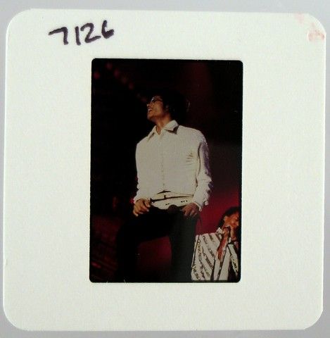 Michael Jackson shouting out to the audience who are sending him hordes of love on Tour circa 1983. These photos were commission by Joe Jackson, father, founder and early manager of his children, Michael Jackson and the Jackson 5. He hired the top music concert photographers of the day to take pictures of Michael Jackson and the Jackson Five (both in individual performances and as a group), while they were on tour, and during personal appearances, as well as at family get-together's. The purchase of this photo includes the original transparency, and includes a full copyright release for your own personal unlimited reproduction printing and selling to the winning bidder. They are the original 35 millimeter film used to take the picture, and are professionally mounted in “slide” paper for protection. The original film sprockets can be seen when the paper is removed. The color reversal film was used by these photographers, because, as is standard in the industry, this film stock creates more detailed images especially in Concert and low-light situations, and in many ways is actually superior to color negative film stock for reproduction purposes. Bidders are advised that Jackson Entertainment Corp. and the Estate of Michael Jackson have asserted a claim that they are the owners of the copyright in this photo and/or rights to the reproduction of Michael Jackson’s image. Bidders are advised that all proceeds from sales and delivery of the purchased items will be held by Premiere Props in escrow pending resolution of these claims unless the successful bidders assume the risk.