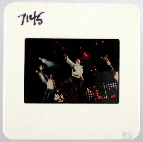 Michael Jackson in mid-leap with his back-up singer-dancers on tour circa 1983. These photos were commission by Joe Jackson, father, founder and early manager of his children, Michael Jackson and the Jackson 5. He hired the top music concert photographers of the day to take pictures of Michael Jackson and the Jackson Five (both in individual performances and as a group), while they were on tour, and during personal appearances, as well as at family get-together's. The purchase of this photo includes the original transparency, and includes a full copyright release for your own personal unlimited reproduction printing and selling to the winning bidder. They are the original 35 millimeter film used to take the picture, and are professionally mounted in “slide” paper for protection. The original film sprockets can be seen when the paper is removed. The color reversal film was used by these photographers, because, as is standard in the industry, this film stock creates more detailed images especially in Concert and low-light situations, and in many ways is actually superior to color negative film stock for reproduction purposes. Bidders are advised that Jackson Entertainment Corp. and the Estate of Michael Jackson have asserted a claim that they are the owners of the copyright in this photo and/or rights to the reproduction of Michael Jackson’s image. Bidders are advised that all proceeds from sales and delivery of the purchased items will be held by Premiere Props in escrow pending resolution of these claims unless the successful bidders assume the risk.