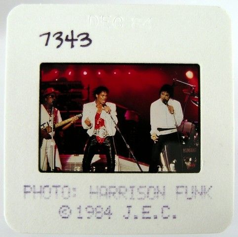 Michael and "company" on his legendary Victory Tour circa 1983 with his brothers. These photos were commission by Joe Jackson, father, founder and early manager of his children, Michael Jackson and the Jackson 5. He hired the top music concert photographers of the day to take pictures of Michael Jackson and the Jackson Five (both in individual performances and as a group), while they were on tour, and during personal appearances, as well as at family get-together's. The purchase of this photo includes the original transparency, and includes a full copyright release for your own personal unlimited reproduction printing and selling to the winning bidder. They are the original 35 millimeter film used to take the picture, and are professionally mounted in “slide” paper for protection. The original film sprockets can be seen when the paper is removed. The color reversal film was used by these photographers, because, as is standard in the industry, this film stock creates more detailed images especially in Concert and low-light situations, and in many ways is actually superior to color negative film stock for reproduction purposes. Bidders are advised that Jackson Entertainment Corp. and the Estate of Michael Jackson have asserted a claim that they are the owners of the copyright in this photo and/or rights to the reproduction of Michael Jackson’s image. Bidders are advised that all proceeds from sales and delivery of the purchased items will be held by Premiere Props in escrow pending resolution of these claims unless the successful bidders assume the risk.