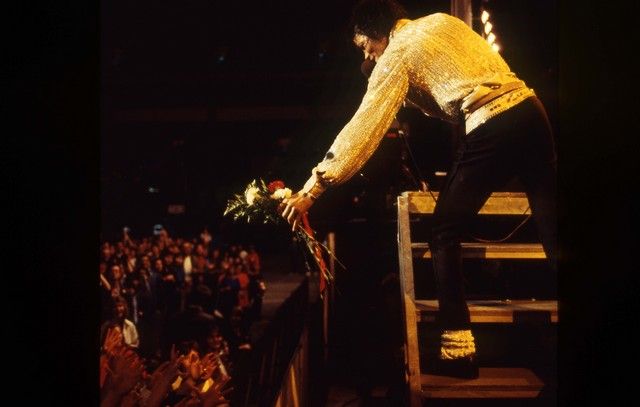 Michael Jackson accepting flowers from the audience on his Victory Tour circa 1983. These photos were commission by Joe Jackson, father, founder and early manager of his children, Michael Jackson and the Jackson 5. He hired the top music concert photographers of the day to take pictures of Michael Jackson and the Jackson Five (both in individual performances and as a group), while they were on tour, and during personal appearances, as well as at family get-together's. The purchase of this photo includes the original transparency, and includes a full copyright release for your own personal unlimited reproduction printing and selling to the winning bidder. They are the original 35 millimeter film used to take the picture, and are professionally mounted in “slide” paper for protection. The original film sprockets can be seen when the paper is removed. The color reversal film was used by these photographers, because, as is standard in the industry, this film stock creates more detailed images especially in Concert and low-light situations, and in many ways is actually superior to color negative film stock for reproduction purposes. Bidders are advised that Jackson Entertainment Corp. and the Estate of Michael Jackson have asserted a claim that they are the owners of the copyright in this photo and/or rights to the reproduction of Michael Jackson’s image. Bidders are advised that all proceeds from sales and delivery of the purchased items will be held by Premiere Props in escrow pending resolution of these claims unless the successful bidders assume the risk.