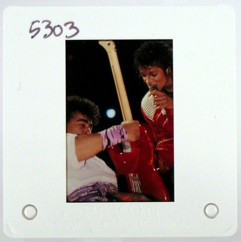 Michael Jackson making love to the beat during his Victory Tour circa 1984. These photos were commission by Joe Jackson, father, founder and early manager of his children, Michael Jackson and the Jackson 5. He hired the top music concert photographers of the day to take pictures of Michael Jackson and the Jackson Five (both in individual performances and as a group), while they were on tour, and during personal appearances, as well as at family get-together's. The purchase of this photo includes the original transparency, and includes a full copyright release for your own personal unlimited reproduction printing and selling to the winning bidder. They are the original 35 millimeter film used to take the picture, and are professionally mounted in “slide” paper for protection. The original film sprockets can be seen when the paper is removed. The color reversal film was used by these photographers, because, as is standard in the industry, this film stock creates more detailed images especially in Concert and low-light situations, and in many ways is actually superior to color negative film stock for reproduction purposes. Bidders are advised that all proceeds from sales and delivery of the purchased items will be held by Premiere Props in escrow pending resolution of these claims unless the successful bidders assume the risk.
